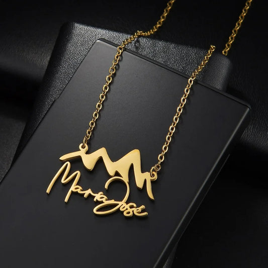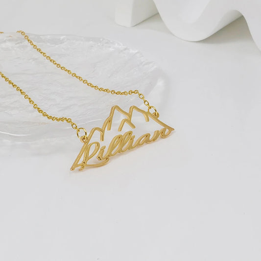 登山愛好家のための山のイメージとカスタム名前切り抜きのペンダントネックレス