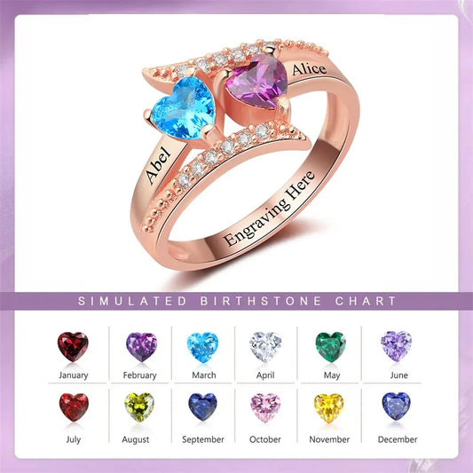 輝くローズゴールドとハートの人工ダイヤモンドの誕生石 ネーム刻印リング 指輪